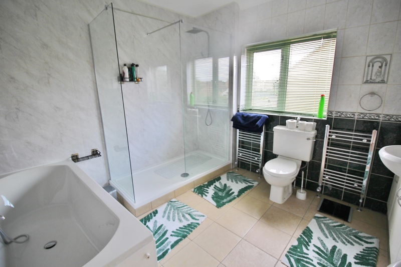 Fitted with a four piece suite comprising a bath, separate shower enclosure with rainfall shower head, twin sink and low level WC, tiled surround, two heated towel rail, extractor fan, uPVC double glazed window to rear, tiled flooring.