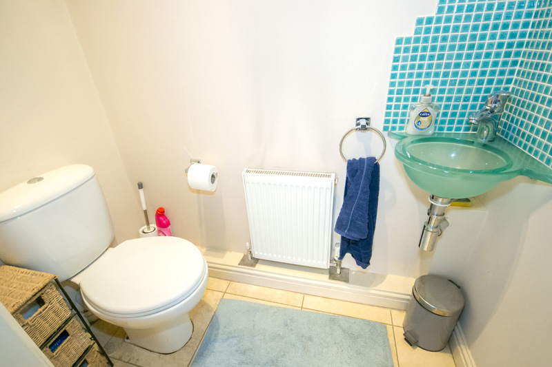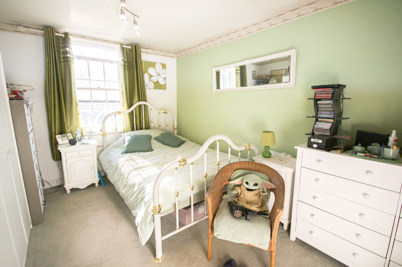 The second-floor landing features a skylight window, filling the area with natural light. The master bedroom is spacious and includes built-in wardrobes and drawers for convenience, creating a peaceful retreat. The accompanying bright en-suite bathroom is complete with a bath, hand-wash basin, and WC. Bedroom three is well-proportioned, offering ample space for free-standing furniture and would make an ideal home office.