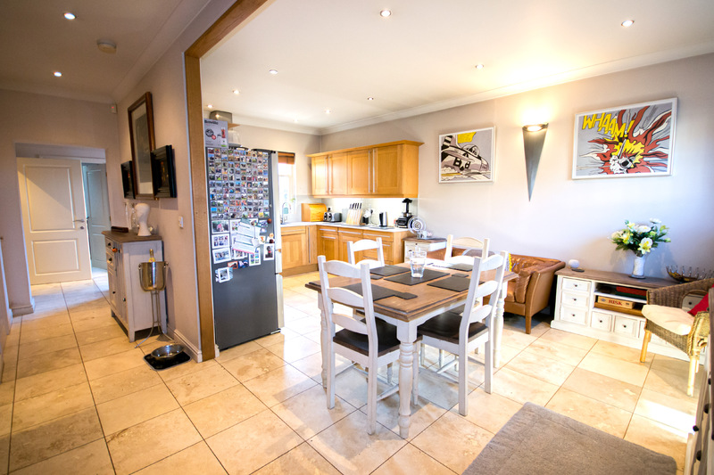 As you enter the house, you're welcomed by a spacious layout, with an elegant bespoke stainless steel, glass and oak staircase leading to the upper floors. The generously-sized kitchen/dining room boasts tiled flooring, with ample space for a dining table and additional furniture. The modern kitchen is equipped with integrated appliances, including a hob, oven, extractor fan, and dishwasher, along with designated space for a fridge. The utility room is practical and convenient, featuring designated areas for a washing machine and tumble dryer, built-in cupboards for storage, and a water softener for water supply. Completing the ground floor is a handy cloakroom with a hand-wash basin and WC.