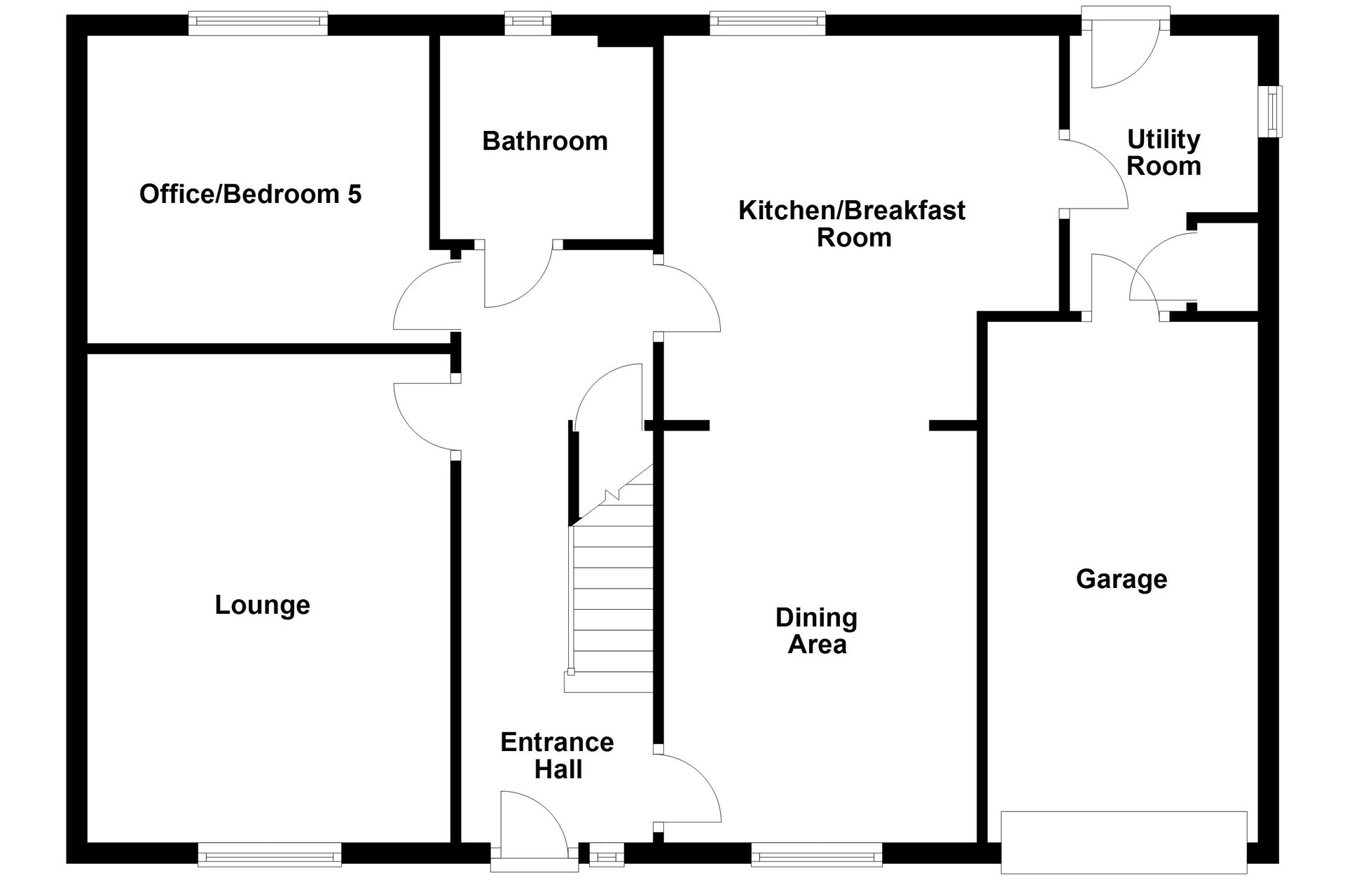 As you enter the house through the front door, you are welcomed by a spacious entrance hall, which features a staircase leading to the first-floor and a practical under-stairs storage cupboard with built-in lighting. The lounge is a cosy and inviting space, offering ample room for free-standing furniture. A designated area for a fireplace enhances the warm and homely atmosphere. A window allows for plenty of natural light and provides pleasant front-facing views. The kitchen/breakfast room boasts a modern and stylish design, creating a sophisticated dark grey ambiance. It features sleek grey cabinets, complemented by dark wooden counter tops and a contemporary black sink. A breakfast bar offers additional dining space, making it perfect for casual meals. Integrated appliances include a hob, double ovens, fridge, freezer, microwave, and dishwasher. A window looks into the rear garden, and provides a scenic view while preparing meals. The hexagonal flooring in the kitchen/breakfast room, dining area, and utility room adds character and a touch of modern flair. Adjoined to the kitchen/breakfast room, the dining area offers a dedicated space for a dining table and chairs, with a front-facing window allowing in natural light. The utility room is a practical addition, featuring dark counter tops, a sink, and a storage cupboard. A designated space is included for a washing machine. A door provides convenient rear garden access, while another leads directly into the attached garage. The office/bedroom five is a versatile space, allowing you to adapt it to your needs. It can serve as a home office, guest room, or an additional bedroom. A window looks into the rear garden and adds to the room's brightness and appeal. Completing the ground floor is the bathroom, which features partially tiled blue walls and includes a bath with a shower attachment, hand-wash basin, and WC.