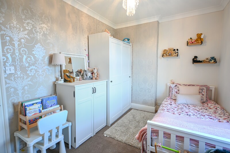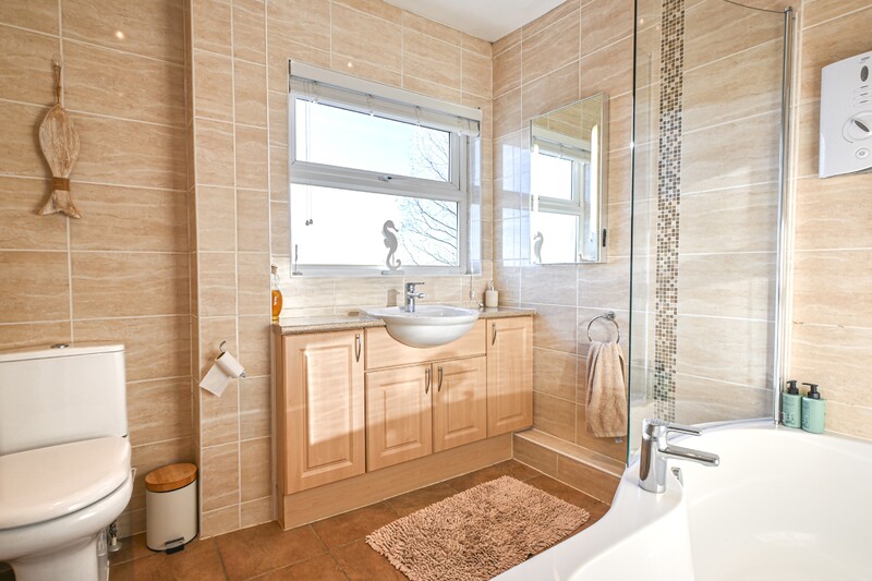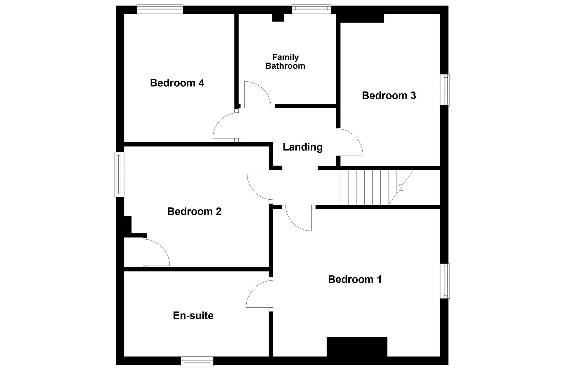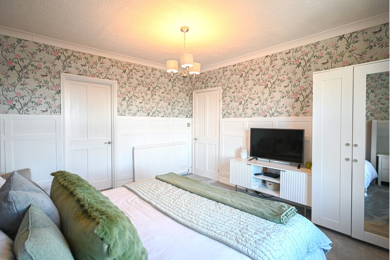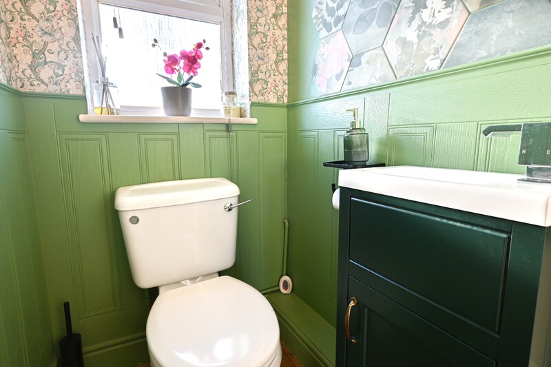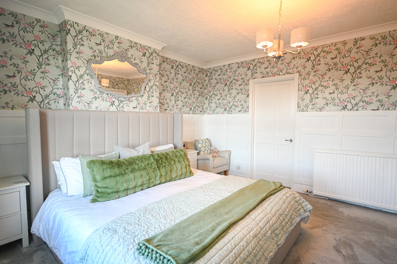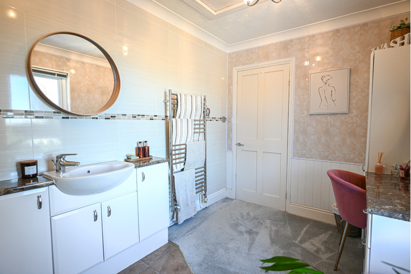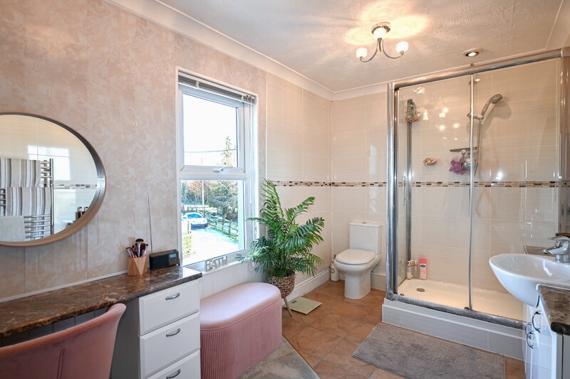 The first-floor offers four double-sized bedrooms, a family bathroom, and an en suite, making it ideal for families. The family bathroom is a bright room, naturally lit by a window. It is fitted with a bath, hand-wash basin, and WC. Bedroom one is a cosy yet well-designed bedroom, offering ample space for a double bed alongside additional bedroom furnishings. A window allows natural light to flow into the room, creating a warm and inviting atmosphere. This bedroom benefits from a private en suite. The en suite is well laid out and features a shower, hand-wash basin, and WC, along with a built-in desk area, ideal for a dressing table, makeup station, or getting ready space. Bedroom two is a double bedroom, brightened by a window and offers plenty of space for a bed and additional furniture. A built-in airing cupboard is provided. Bedroom three is also a double-sized room, offering space for a bed and additional furnishings, making it a versatile addition to the home. Bedroom four is a further double bedroom and enjoys pleasant views over the rear garden and open fields beyond.