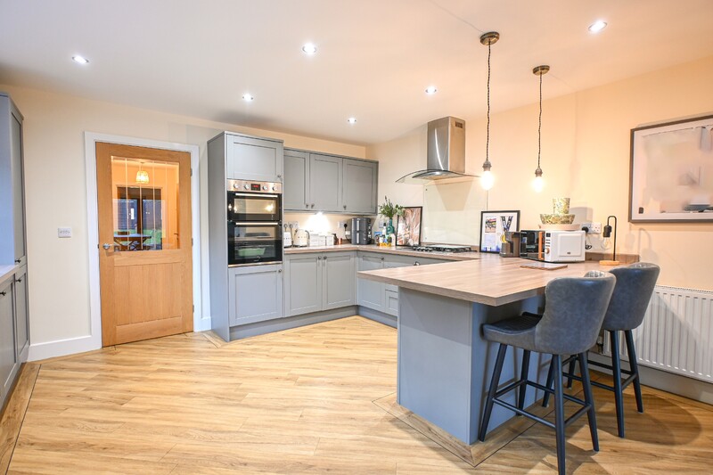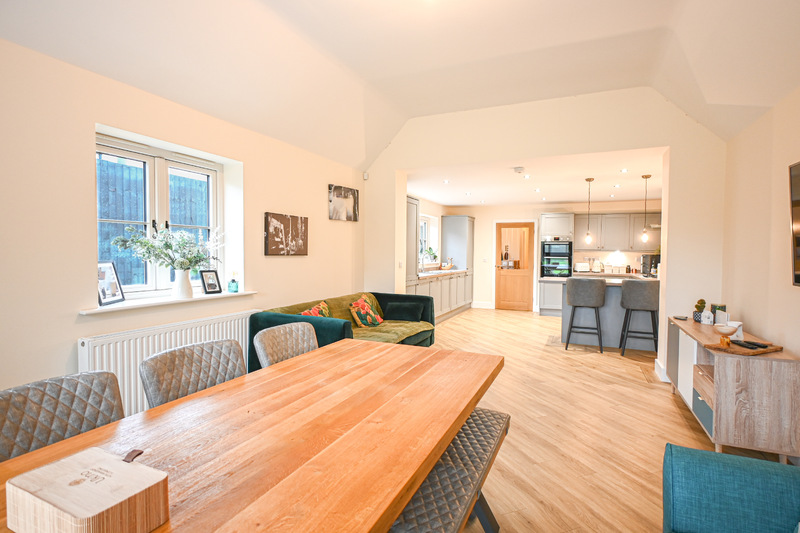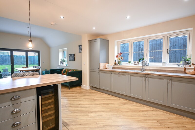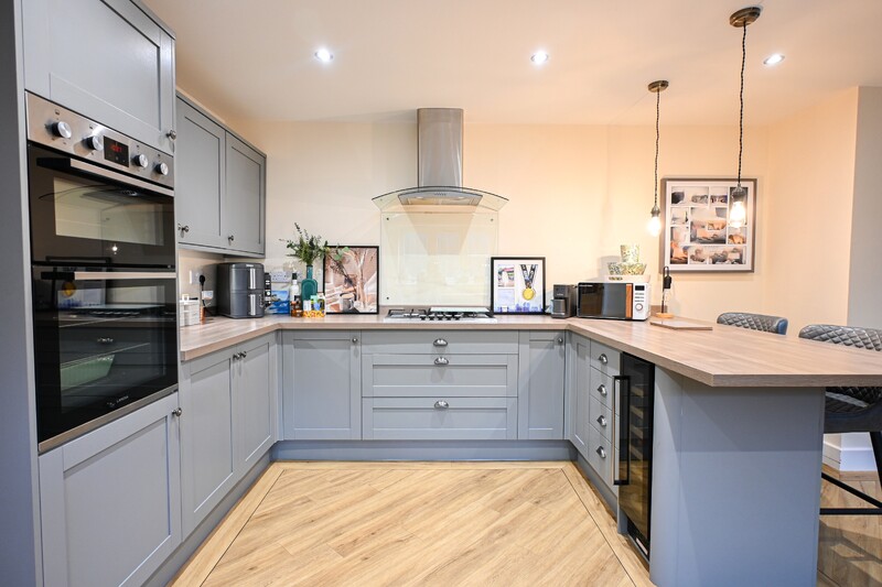 As you step inside, your greeted by the entrance hall. This space provides access to the stairs leading to the first-floor, and a useful storage cupboard. Just off the hall is the office, a practical and adaptable space ideal for remote working. This room could also be transformed to suit your needs. The ground-floor shower room is a convenient addition, featuring a shower, hand wash basin, WC, and a wall-mounted radiator. A cupboard within this area houses the boiler. The lounge is a cosy and comfortable space, featuring two front-facing windows. There is ample room for free-standing lounge furnishings, and the layout also allows space for a dining table and chairs if desired, making it both practical and versatile. Completing the ground-floor is the impressive kitchen/diner, a generous and open space perfect for family living and entertaining. The modern kitchen area boasts a range of integrated appliances, including an oven, hob, fridge, freezer, dishwasher, washing machine, and a wine cooler. Stylish grey counters add a contemporary finish, while a window allows natural light to flood the space. The adjoining dining area offers ample room for a dining table and chairs set, with additional space for further furnishings if required. Bifold doors open out to the rear garden, seamlessly connecting indoor and outdoor living.