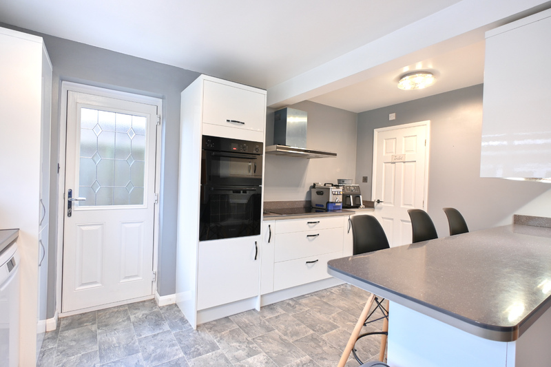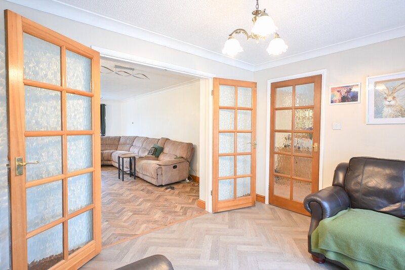 Upon entering, you are welcomed into the entrance hall, which provides space for coats and shoes, stairs leading to the first-floor, and a useful understairs storage cupboard. The office/play room is a versatile and practical room, featuring a window to the front and offering flexibility to suit your needs, ideal as a home office, play room, or dining area. The kitchen/breakfast room is a functional and well-laid-out space. A window looks out to the rear garden, while a breakfast bar provides a convenient spot for casual dining. Integrated appliances include an oven and touch-screen hob, with additional space for a fridge/freezer, washing machine, and dishwasher. A door from the kitchen leads out to the side, providing access to the rear garden. The downstairs cloakroom features a hand-wash basin and WC, adding everyday practicality. The lounge is a cosy and well-proportioned room, offering ample space for free-standing furnishings. An electric fire adds warmth and a modern touch, while double doors open out to the rear garden, creating a bright and inviting space. Double doors also lead through to the dining room, which is ideal for family meals. A window to the front allows in natural light.
