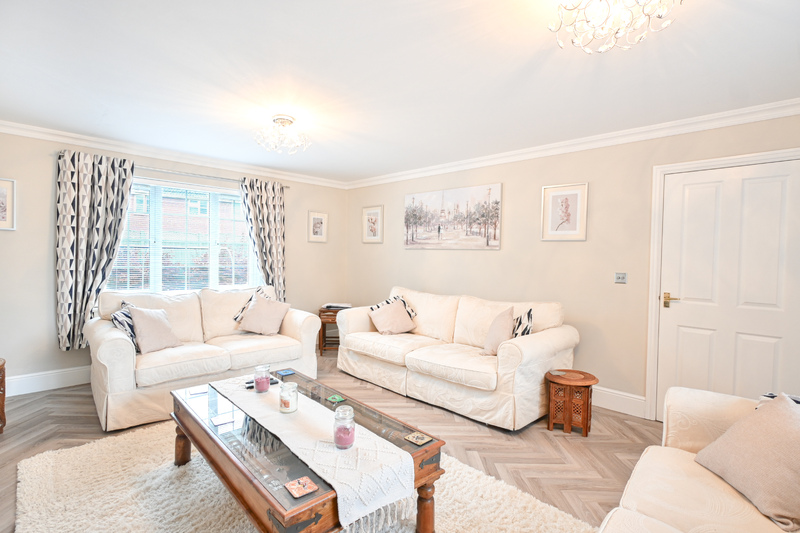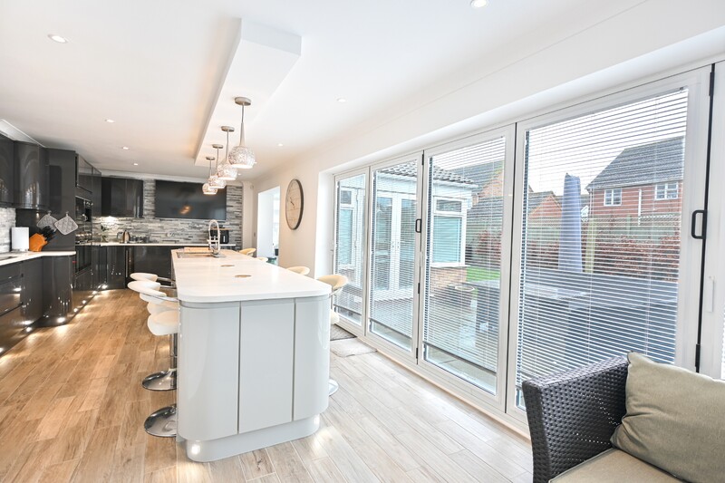 Upon entering the property, you are welcomed by the entrance hall, featuring stylish herringbone flooring. This space also features stairs to the first-floor along with a useful under-stairs storage cupboard. The downstairs cloakroom is neatly presented and comprises a WC, hand-wash basin with under-sink storage, and a radiator. Nearby, the office is a versatile room featuring two radiators and a box window to the front, making it ideal for working from home or as an additional reception room. The lounge is a cosy and inviting space, enhanced by two windows, wall lighting, and an LPG gas fire for added warmth. Two radiators ensure comfort, making this an ideal room to relax and unwind. The utility room provides space for appliances and includes a door leading out to the side of the property with access to the rear garden. The sitting room is a bright space, featuring double doors opening onto the rear garden. This space also features a radiator for warmth. Completing the ground-floor is the stunning kitchen/breakfast room, a real highlight of the home. This modern and spacious area features a large central island, generous bifold doors opening onto the rear garden, and ample space for a dining table and chairs set, perfect for family meals and entertaining. Integrated appliances include two ovens, an induction hob, fridge/freezer, dishwasher, wine cooler, freezer, microwave, and coffee machine.