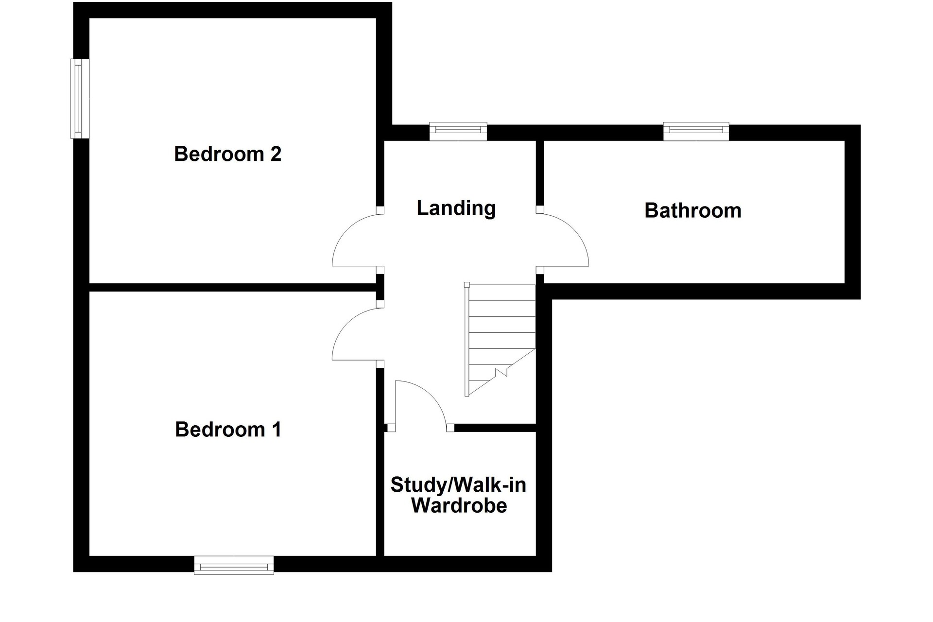 The first-floor hosts the landing, which is brightened by a window. The bathroom is fitted with a bath with shower attachment, a hand-wash basin and a WC. A useful study/walk-in wardrobe provides storage space and could also be utilised as a small home office if required. Bedroom one is a double-sized room with a window to the front, offering space for a double bed and additional furnishings. Bedroom two is another double bedroom, featuring a window allowing natural light and space for bedroom furniture.